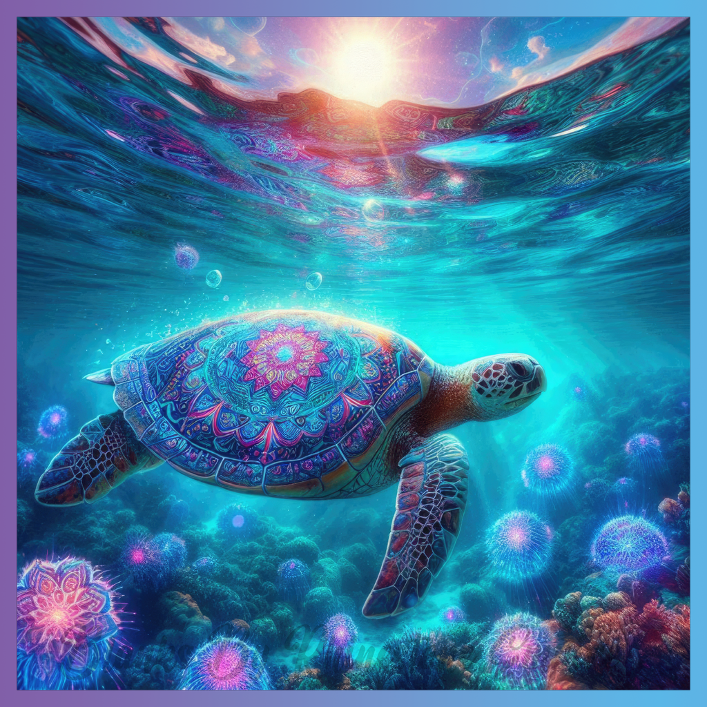 Theme: Turtle with underwater, colorful, patterns, coral.