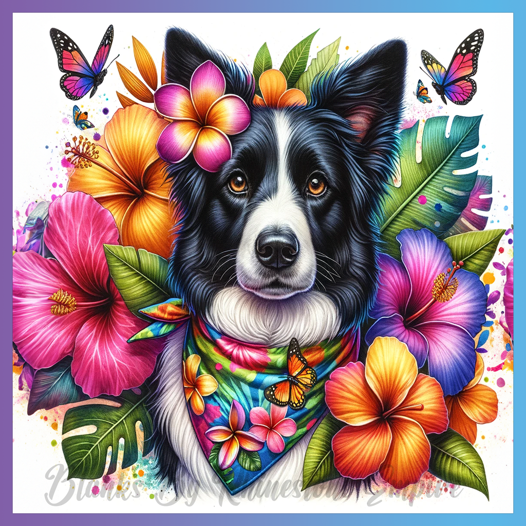 Theme: Dog with flowers, butterflies, tropical, colorful.