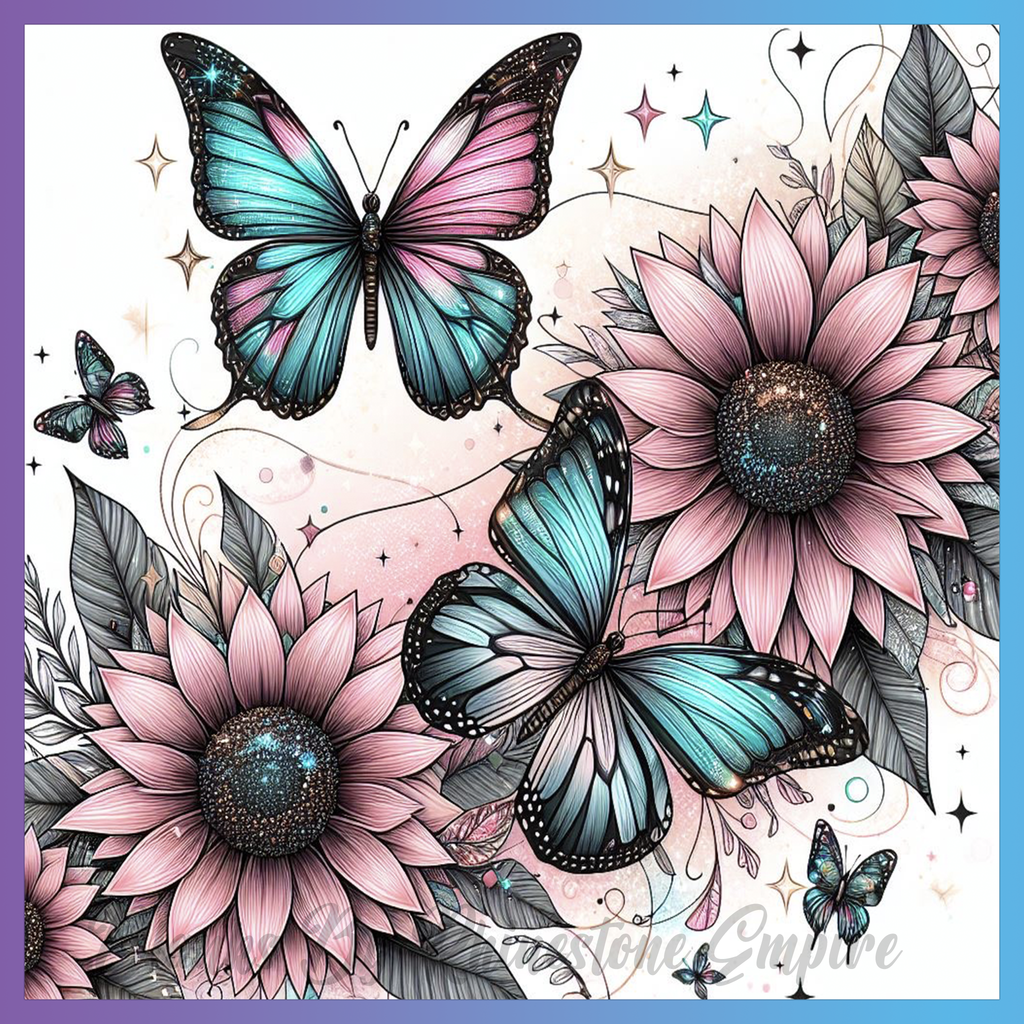 Theme: Butterfly with flowers, pink, blue, decorative.