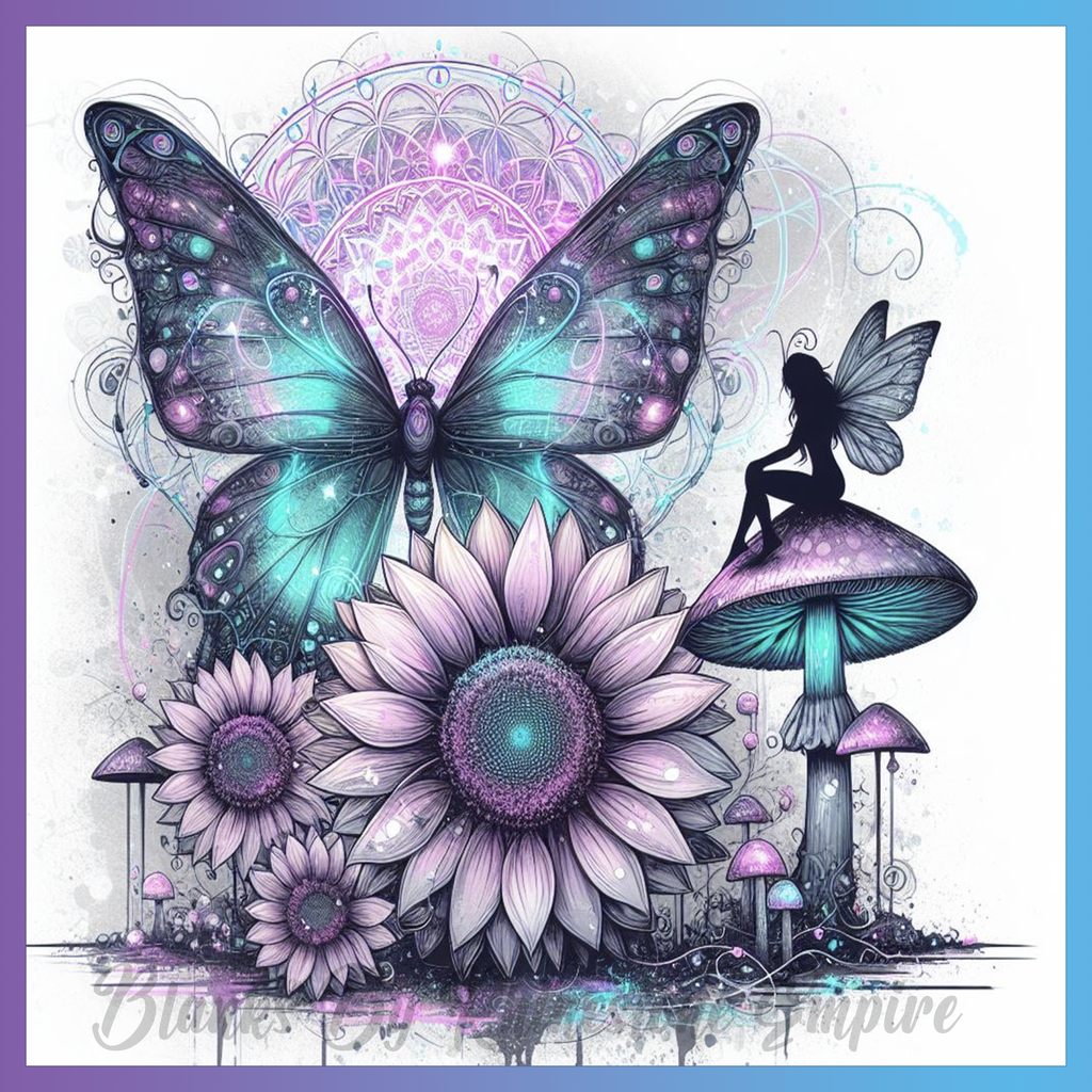 Theme: Butterfly with fairy, mushroom, flowers, colorful.