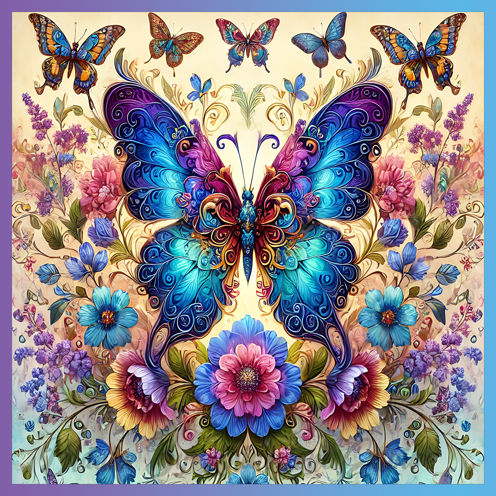 Theme: Butterfly with colorful, flowers, ornate, nature.