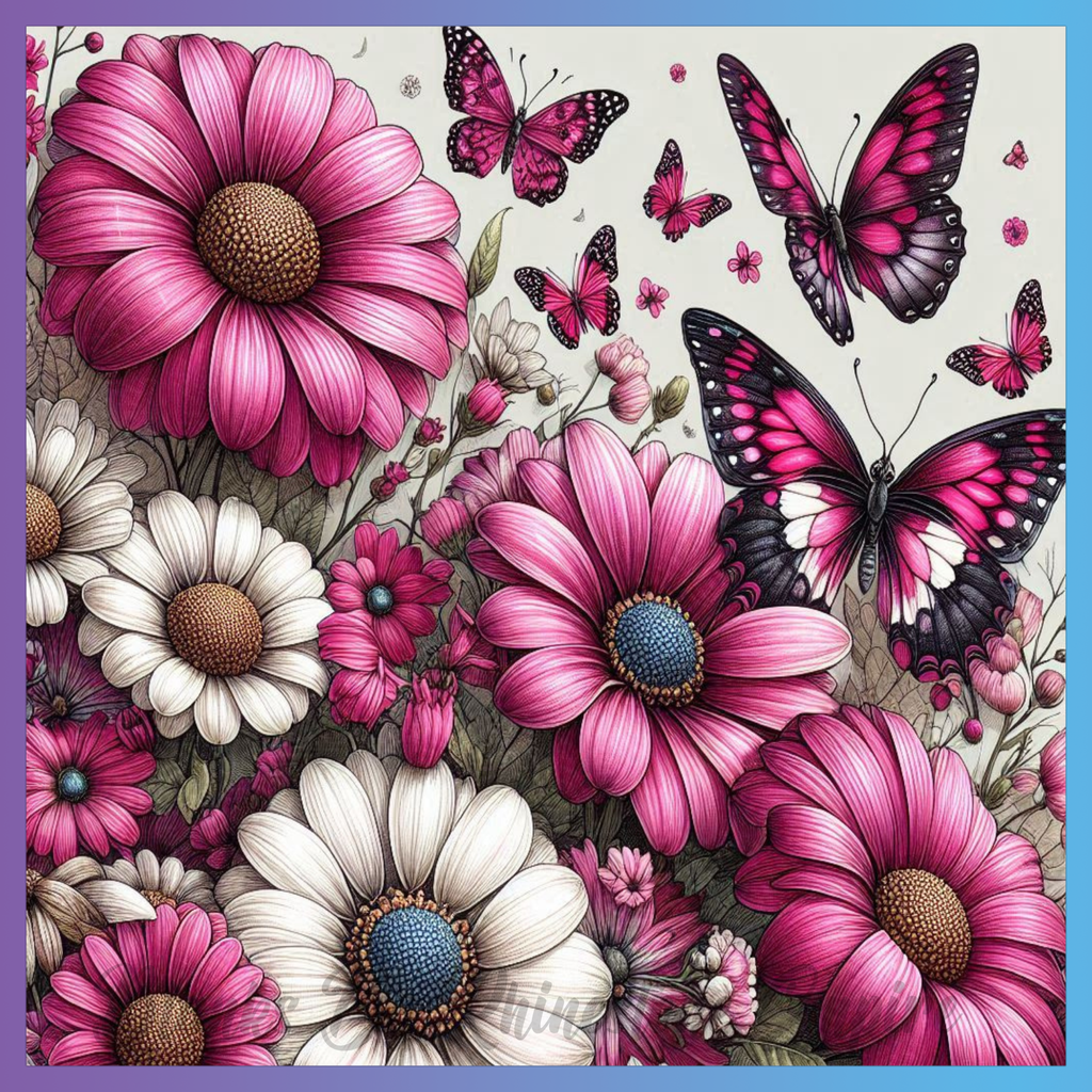 Theme: Butterfly with flowers, pink, daisies, nature.