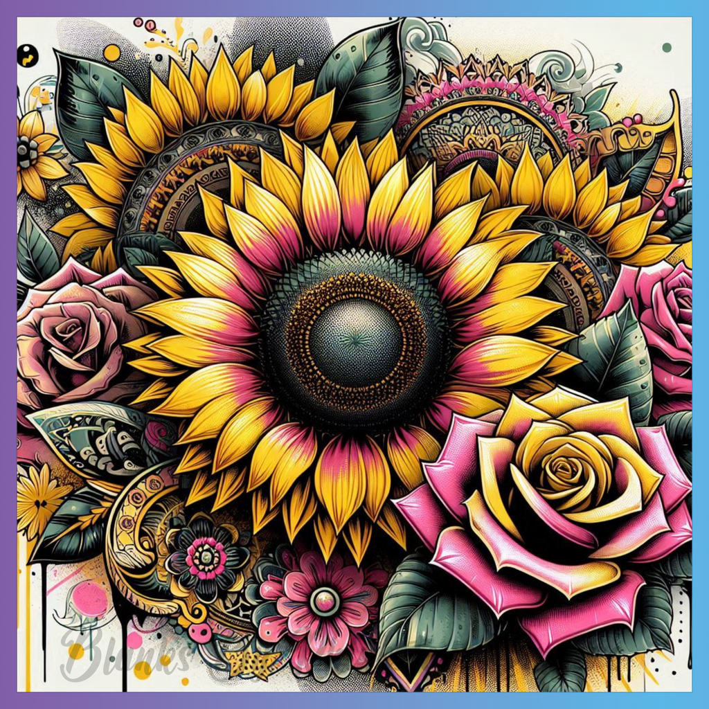 Theme: Flower with sunflower, rose, colorful, ornate.