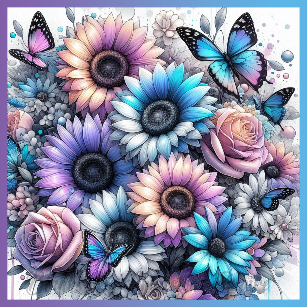 Theme: Flowers with butterflies, colorful, floral, nature.