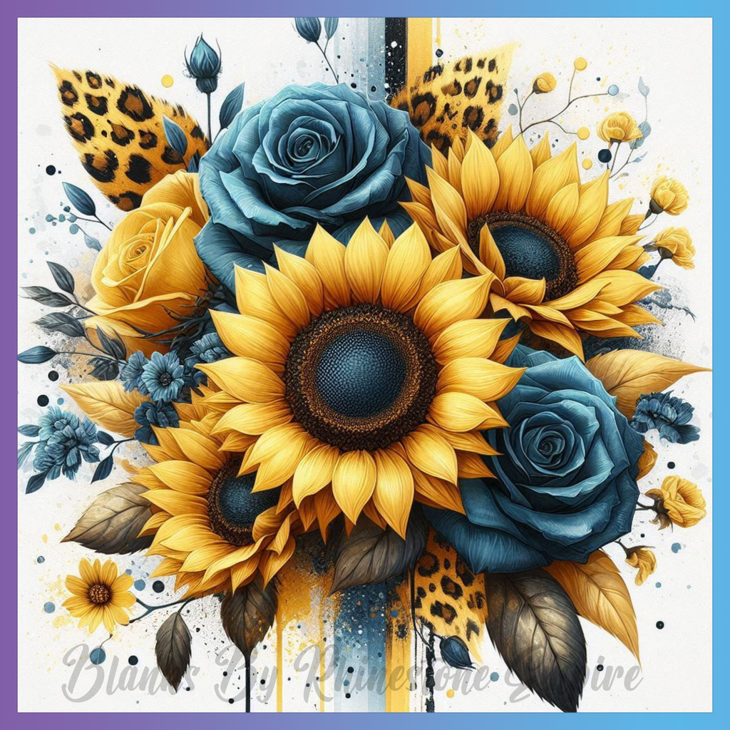 Theme: Flowers with sunflowers, roses, blue, yellow.