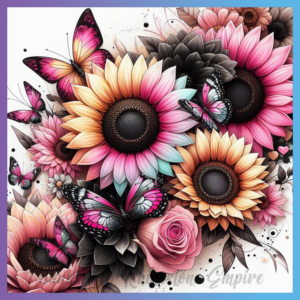 Theme: Flower with sunflower, butterflies, pink, colorful.