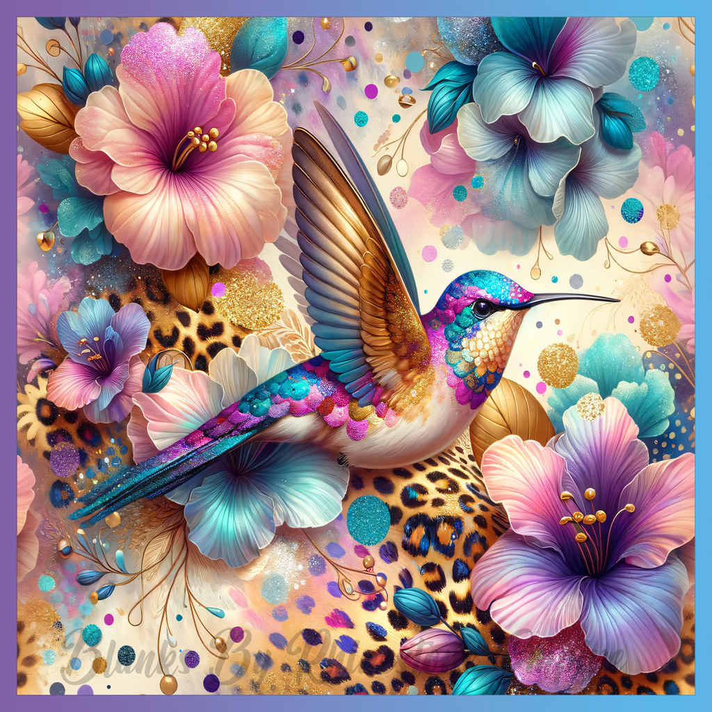 Theme: Hummingbird with flowers, colorful, leopard print, tropical.
