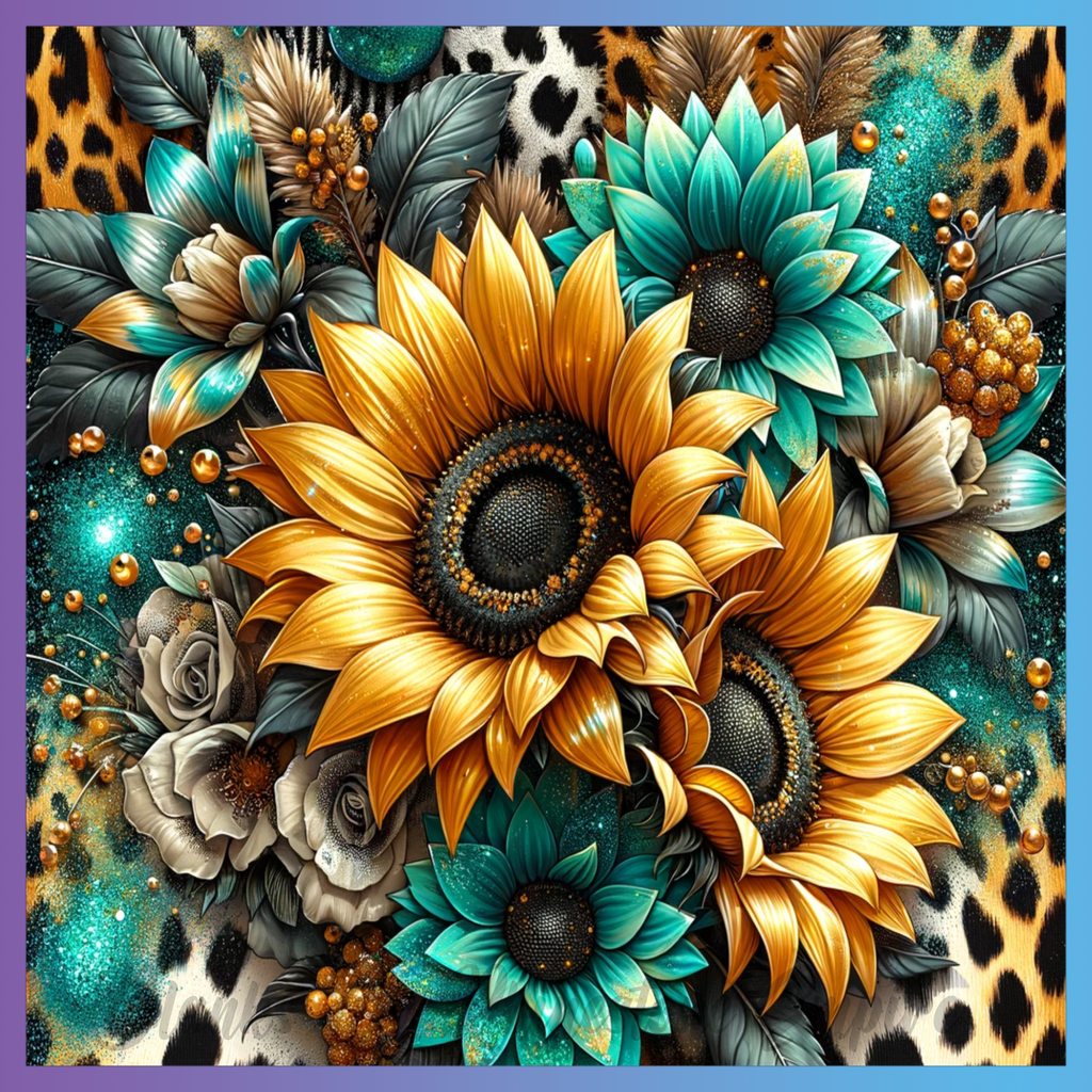 Theme: Flowers with sunflowers, teal, gold, leaves.