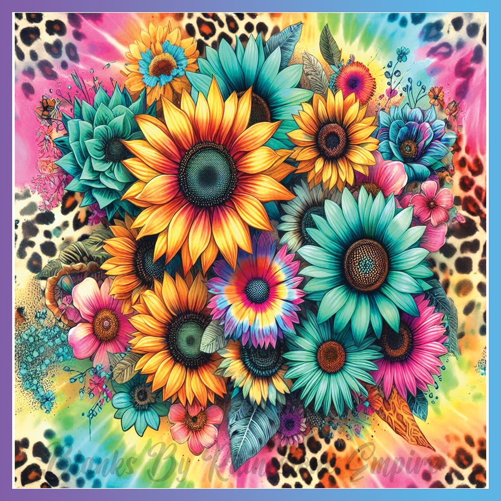 Theme: Flowers with sunflowers, colorful, vibrant, leaves.