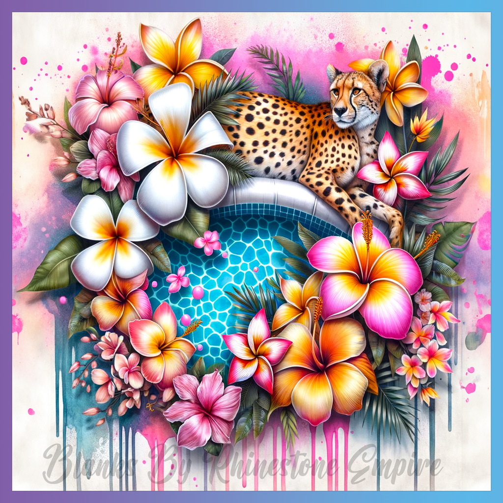Theme: Cheetah with flowers, pool, tropical, vibrant.