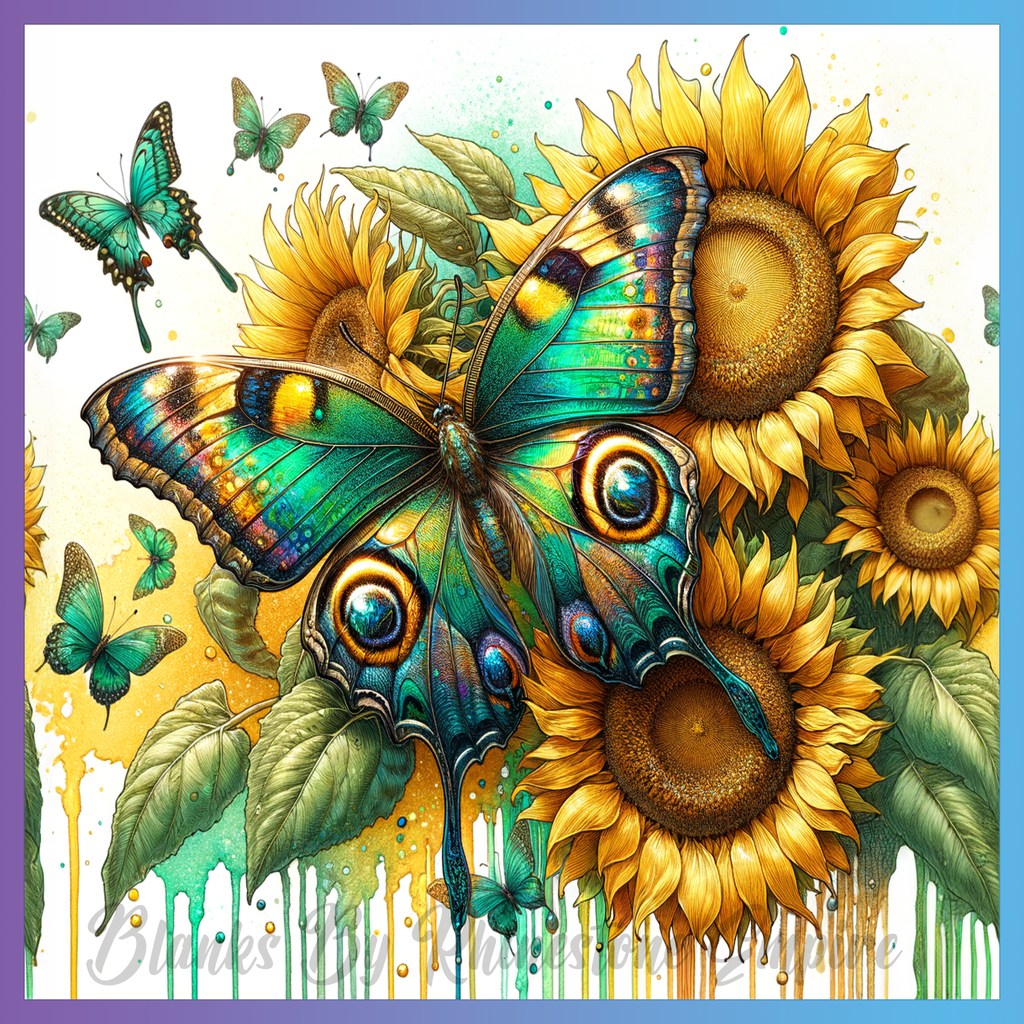 Theme: Butterfly with sunflowers, colorful, nature, insects.