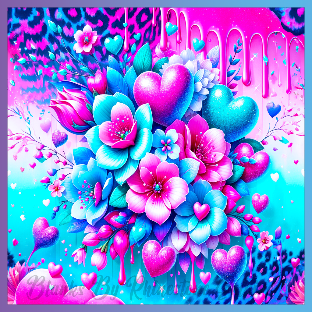 Theme: Flowers with hearts, vibrant, colorful, abstract.