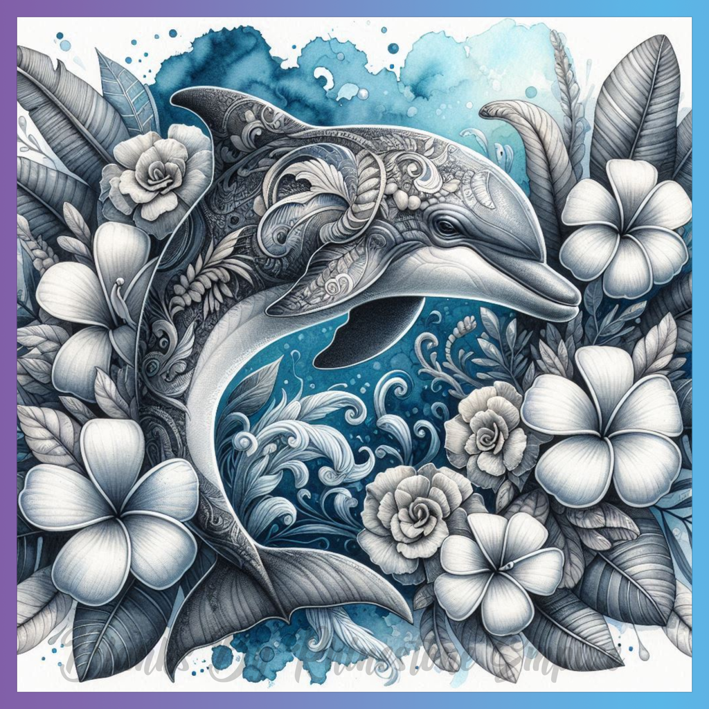 Theme: Dolphin with ornate, flowers, ocean, waves.