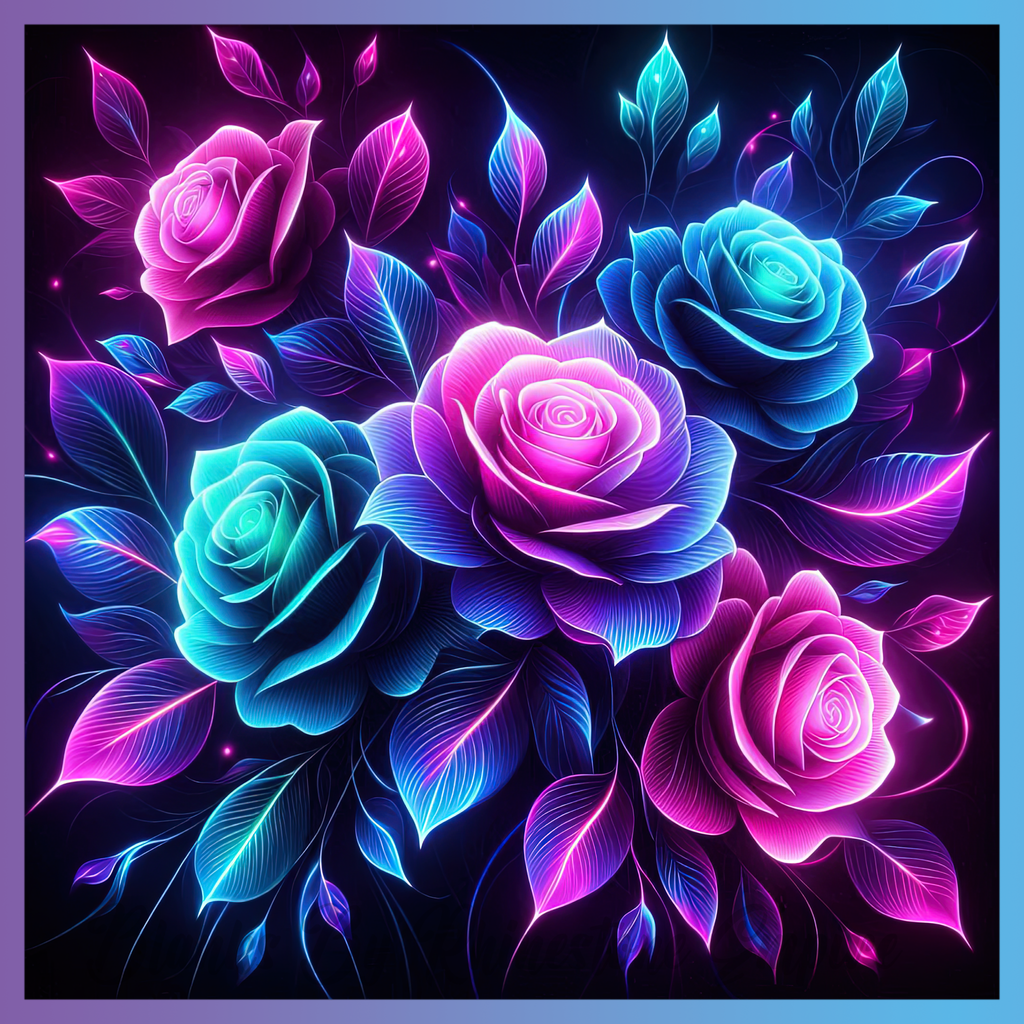 Theme: Rose with neon, flowers, leaves, vibrant.