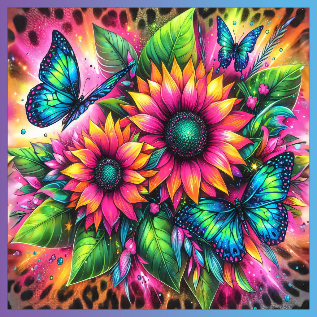 Theme: Flowers with butterflies, vibrant, colorful, leaves.