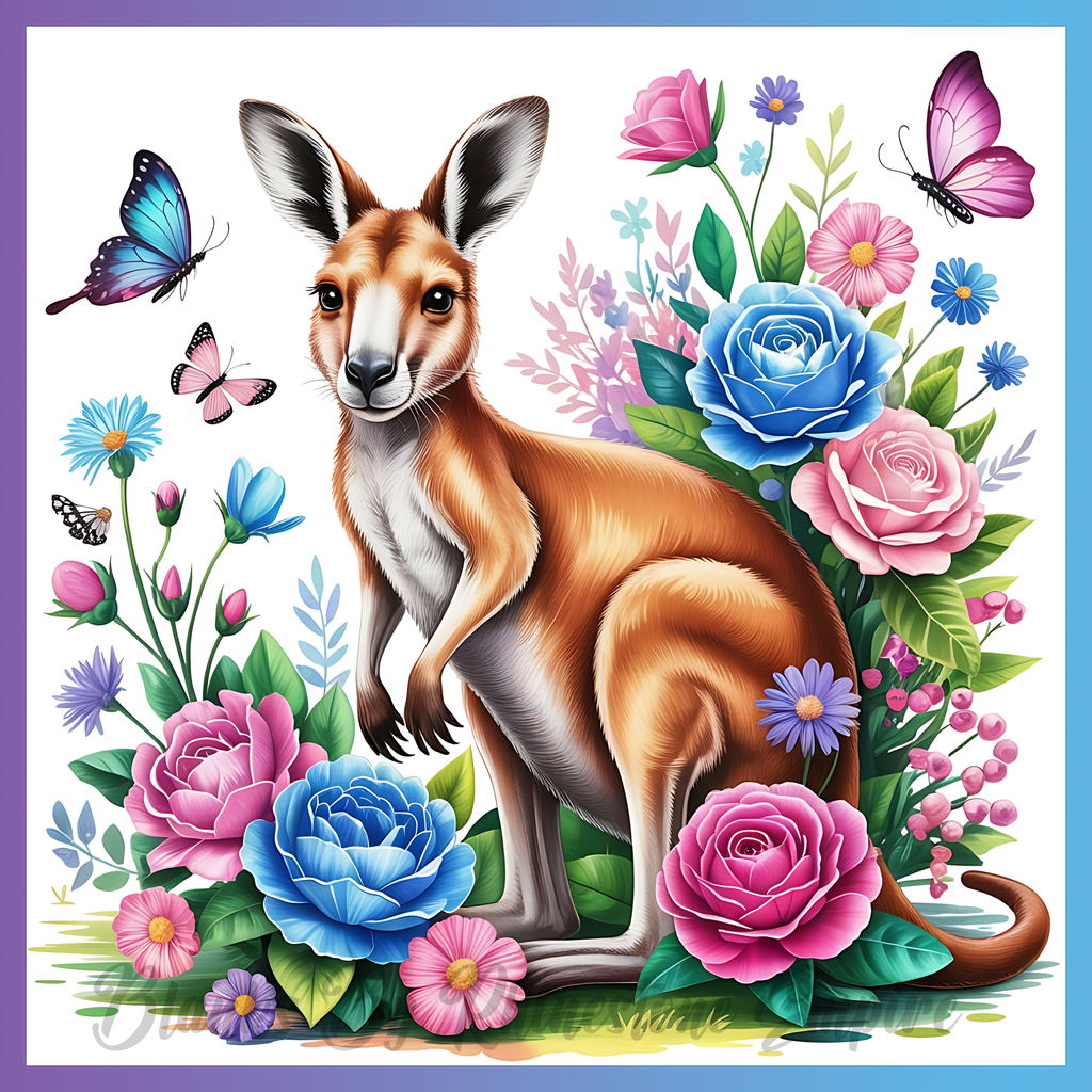 Theme: Kangaroo with flowers, butterflies, colorful, nature.