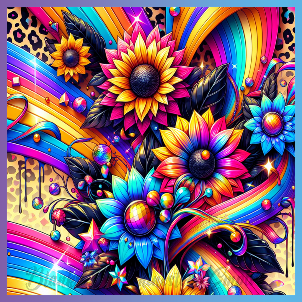 Theme: Flower with colorful, abstract, patterns, ribbons.