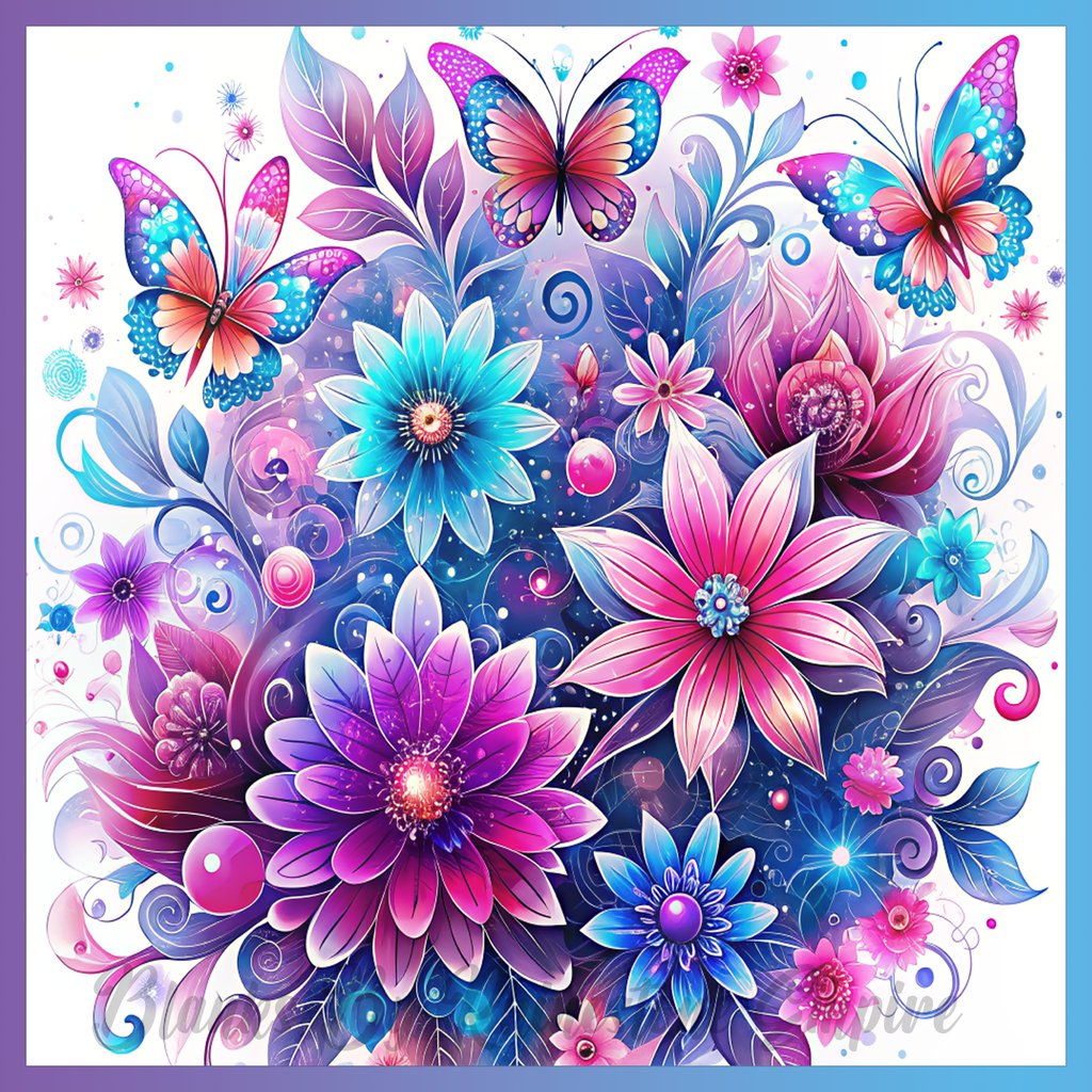 Theme: Flower with butterflies, colorful, abstract, floral.