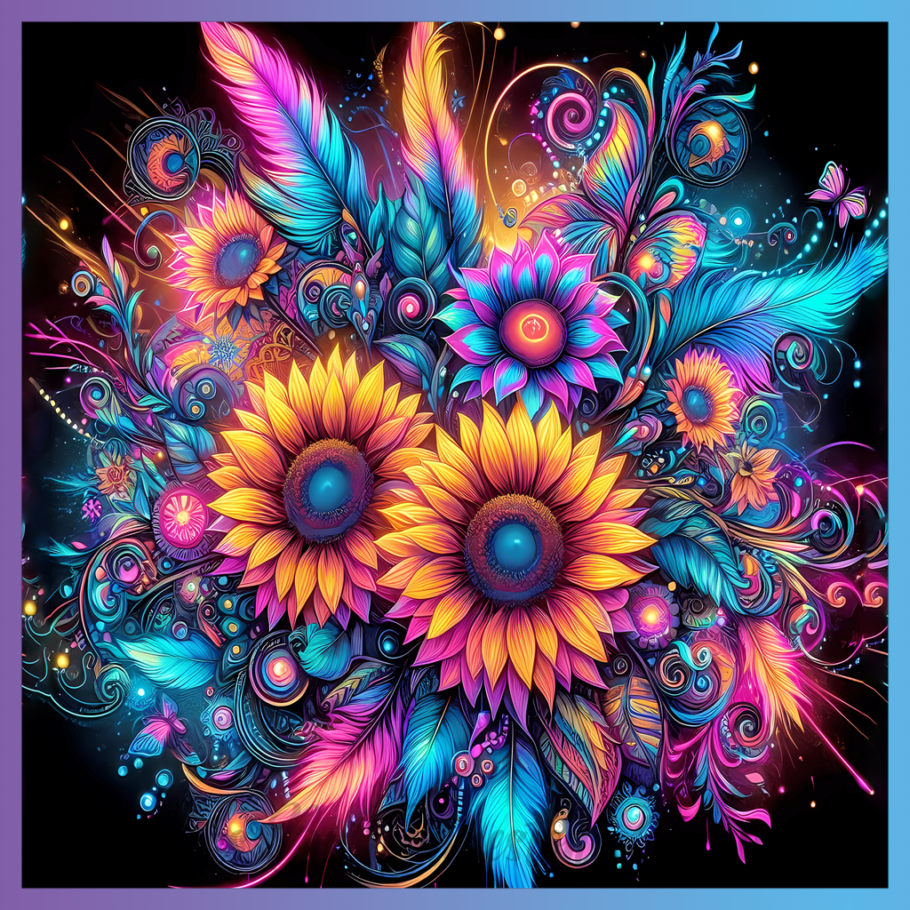 Theme: Flowers with colorful, abstract, feathers, swirls.