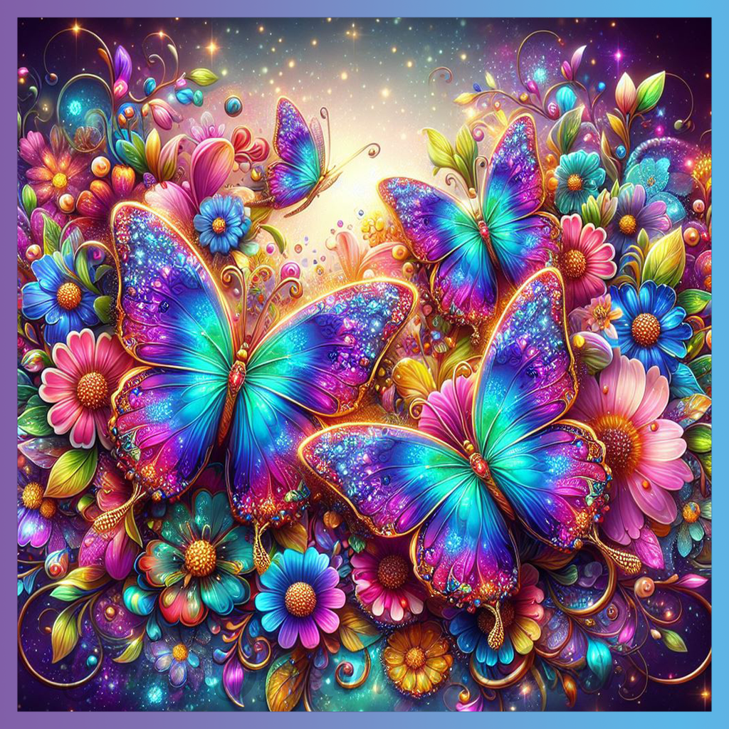 Theme: Butterfly with colorful, flowers, sparkles, nature.