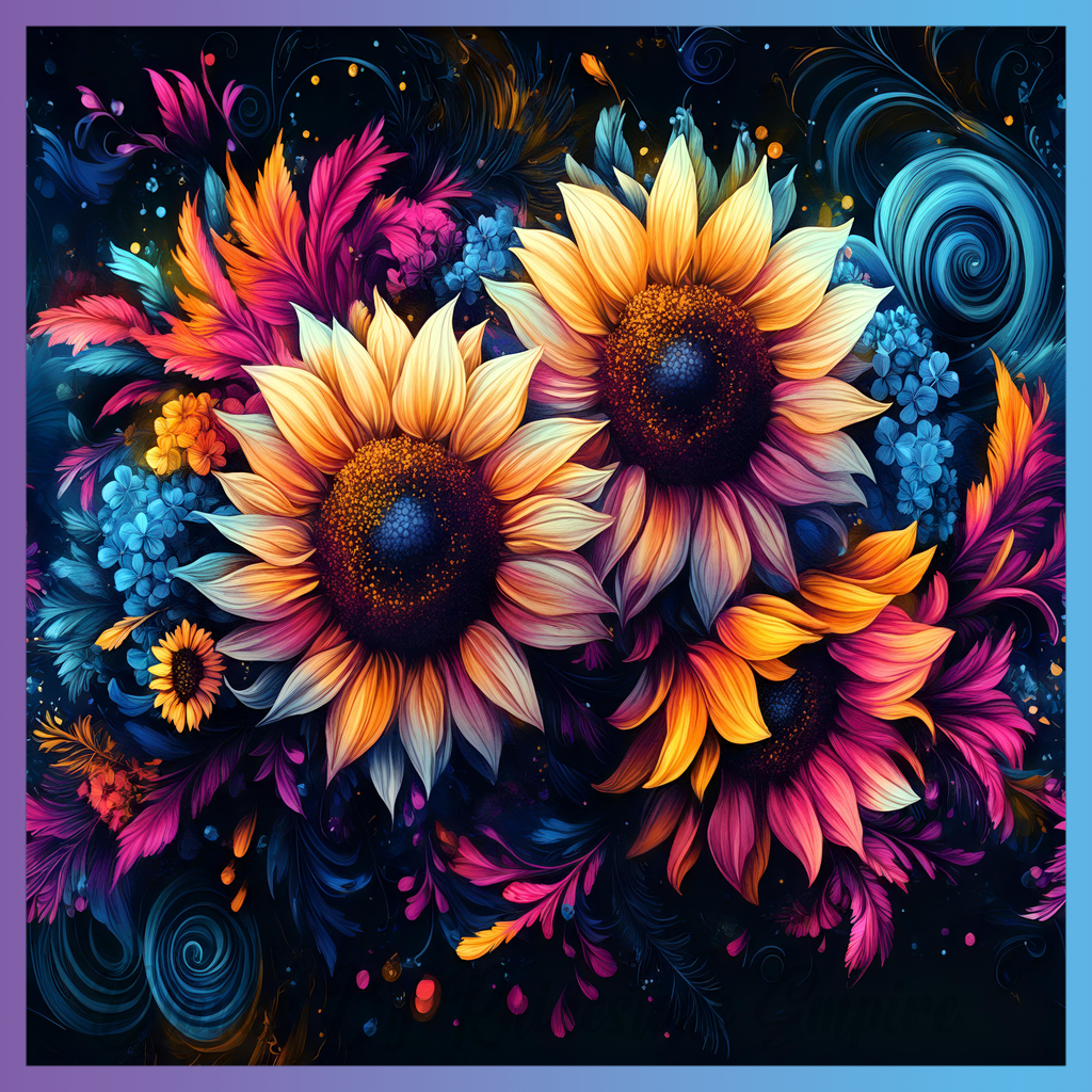 Theme: Sunflower with colorful, floral, vibrant, swirls.