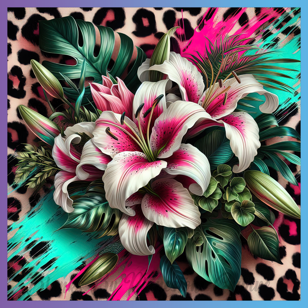 Theme: Lily with flowers, tropical, leaves, vibrant.