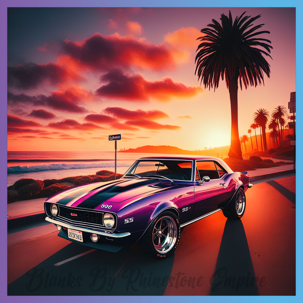 Theme: Car with sunset, palm trees, beach, vintage.