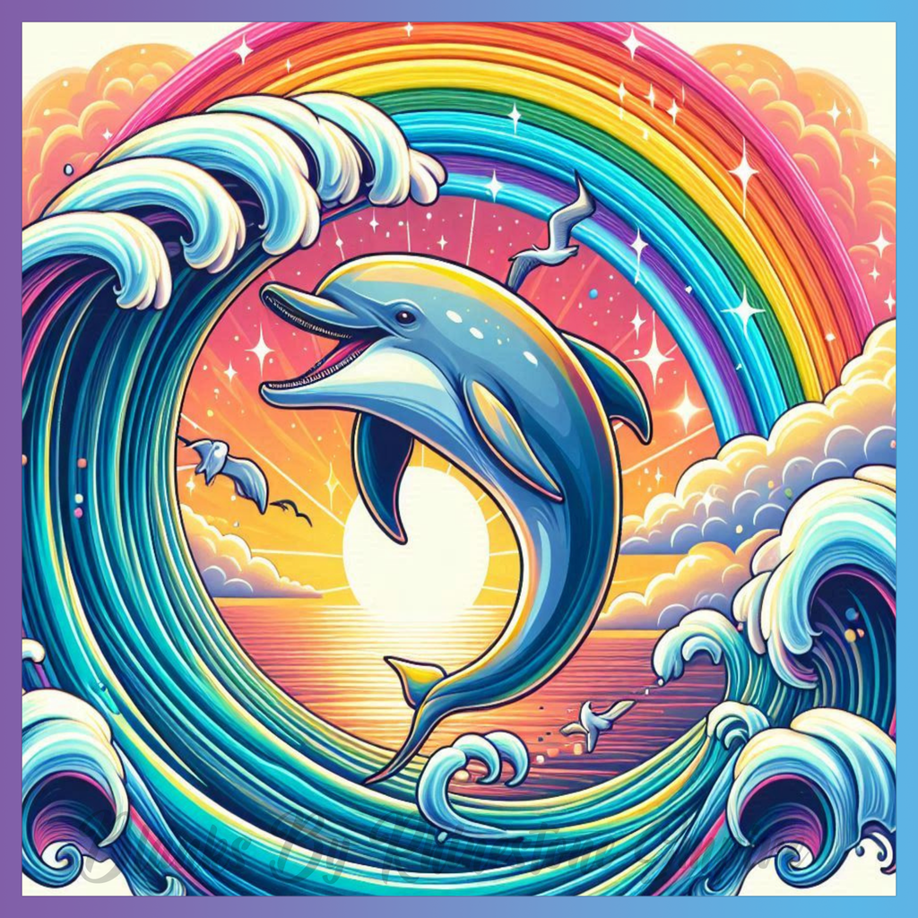 Theme: Dolphin with waves, rainbow, sunset, ocean.