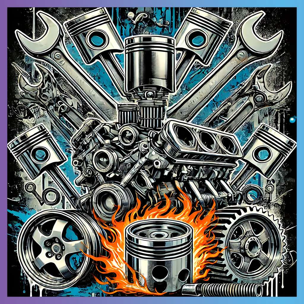Theme: Engine with mechanical, tools, flames, pistons.