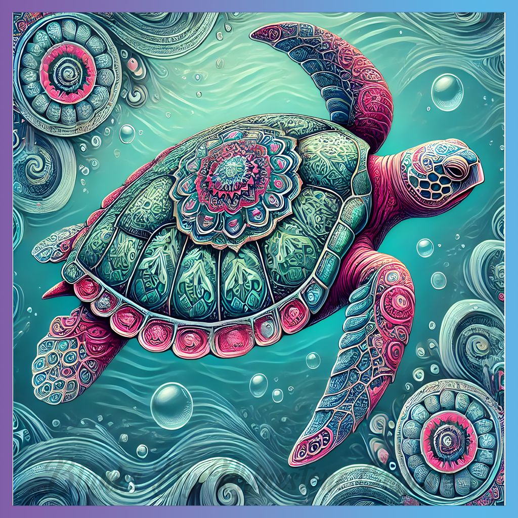 Theme: Turtle with mandala, ocean, swirls, bubbles.
