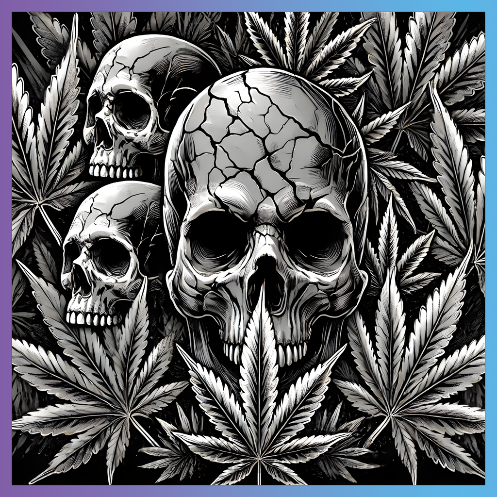 Theme: Skull with cannabis, leaves, black, detailed.