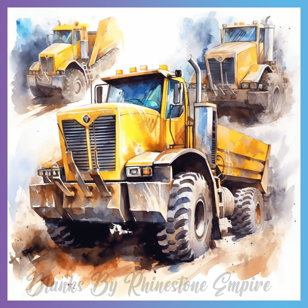 Theme: Truck with yellow, construction, watercolor, heavy machinery.