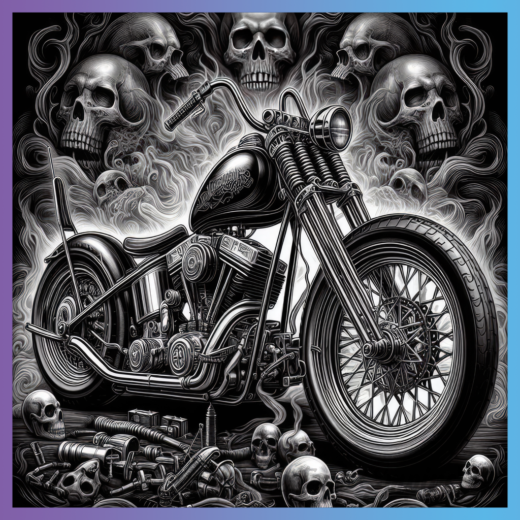 Theme: Motorcycle with skulls, smoke, black and white, mechanical.