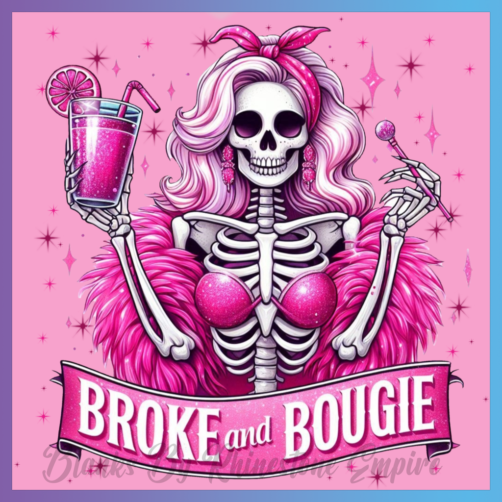 Theme: Skeleton with pink, fur, cocktail, glamorous.