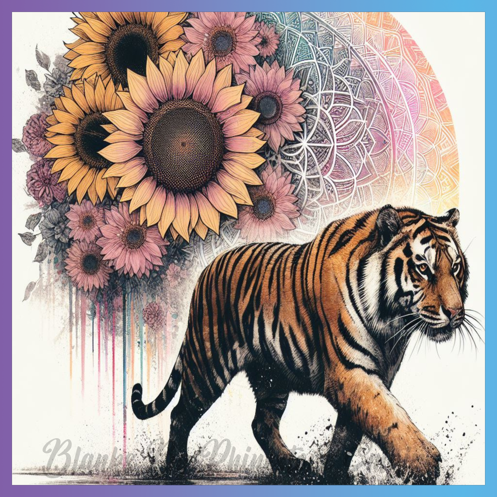 Theme: Tiger with sunflowers, flowers, mandala, colorful.