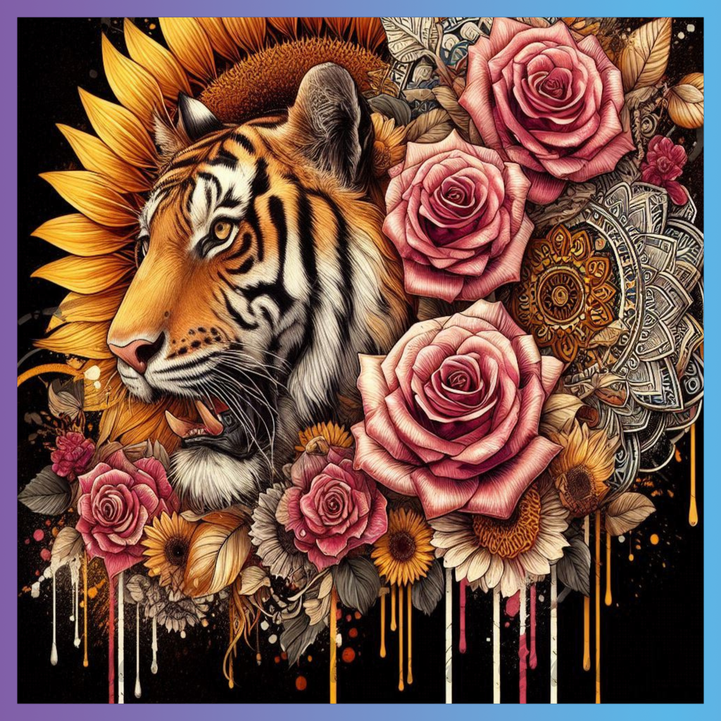 Theme: Tiger with flowers, sunflower, ornamental, vibrant.