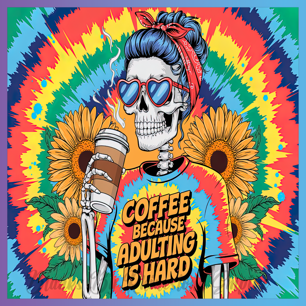Theme: Skeleton with coffee, sunflowers, tie-dye, glasses.