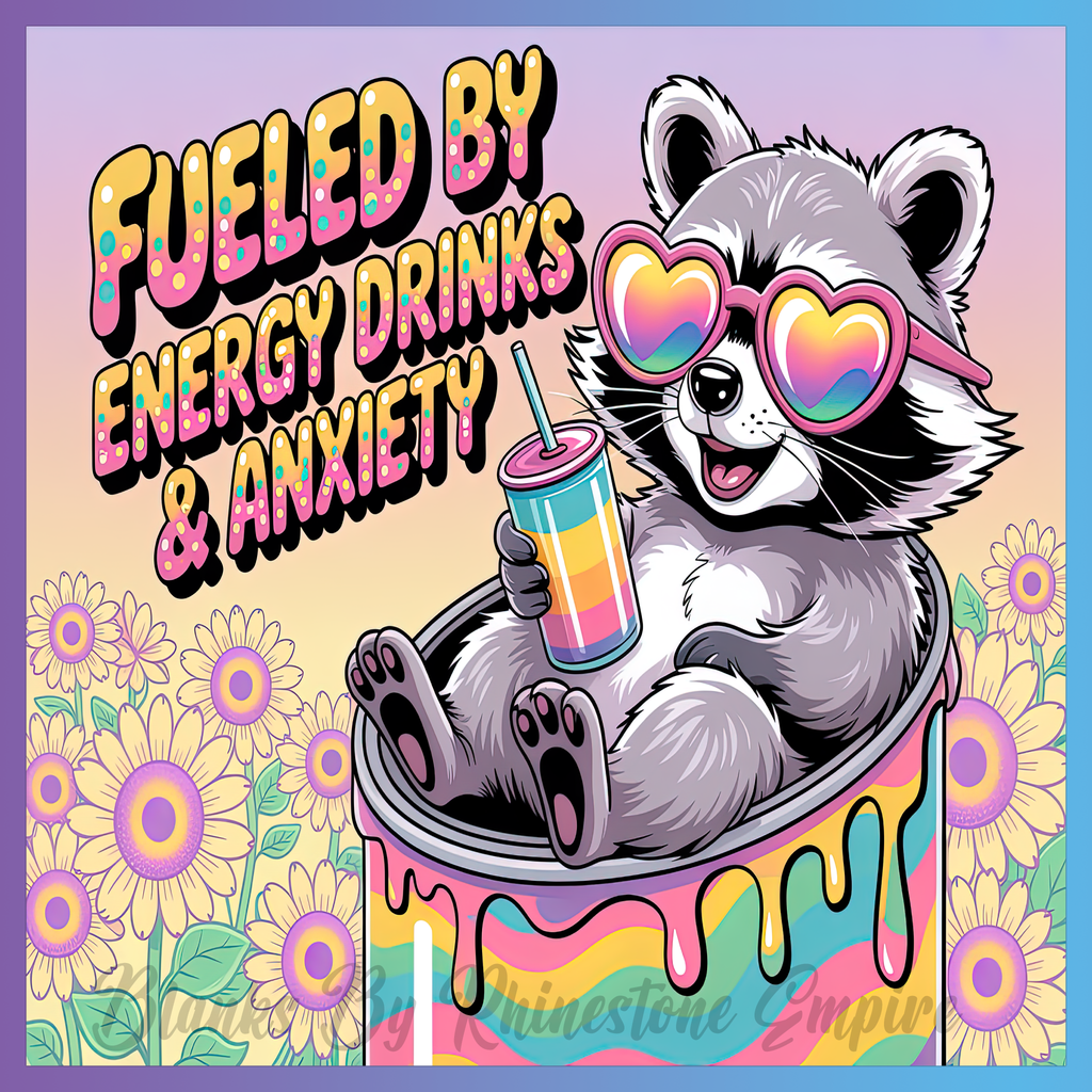 Theme: Raccoon with cartoon, sunglasses, energy drink, flowers.