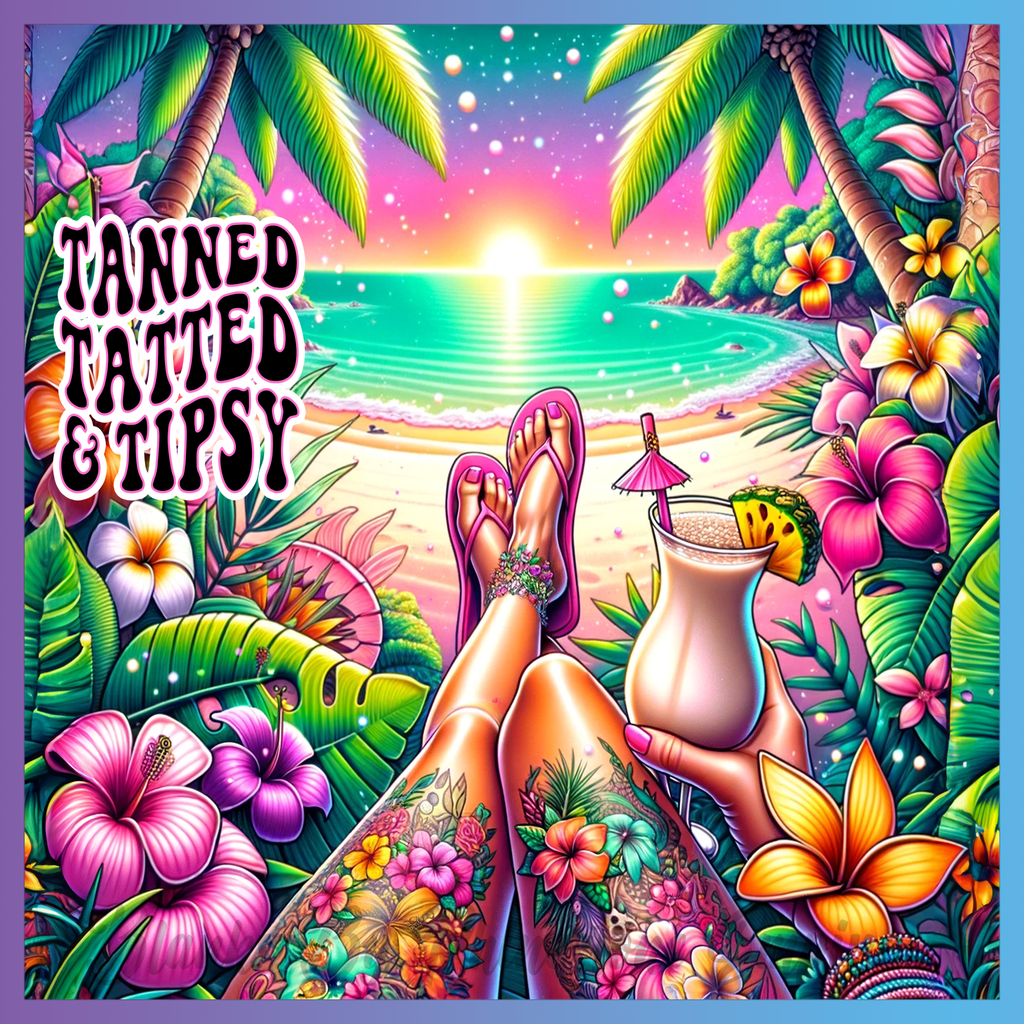 Theme: Girl with tattoo, beach, cocktail, palm trees.