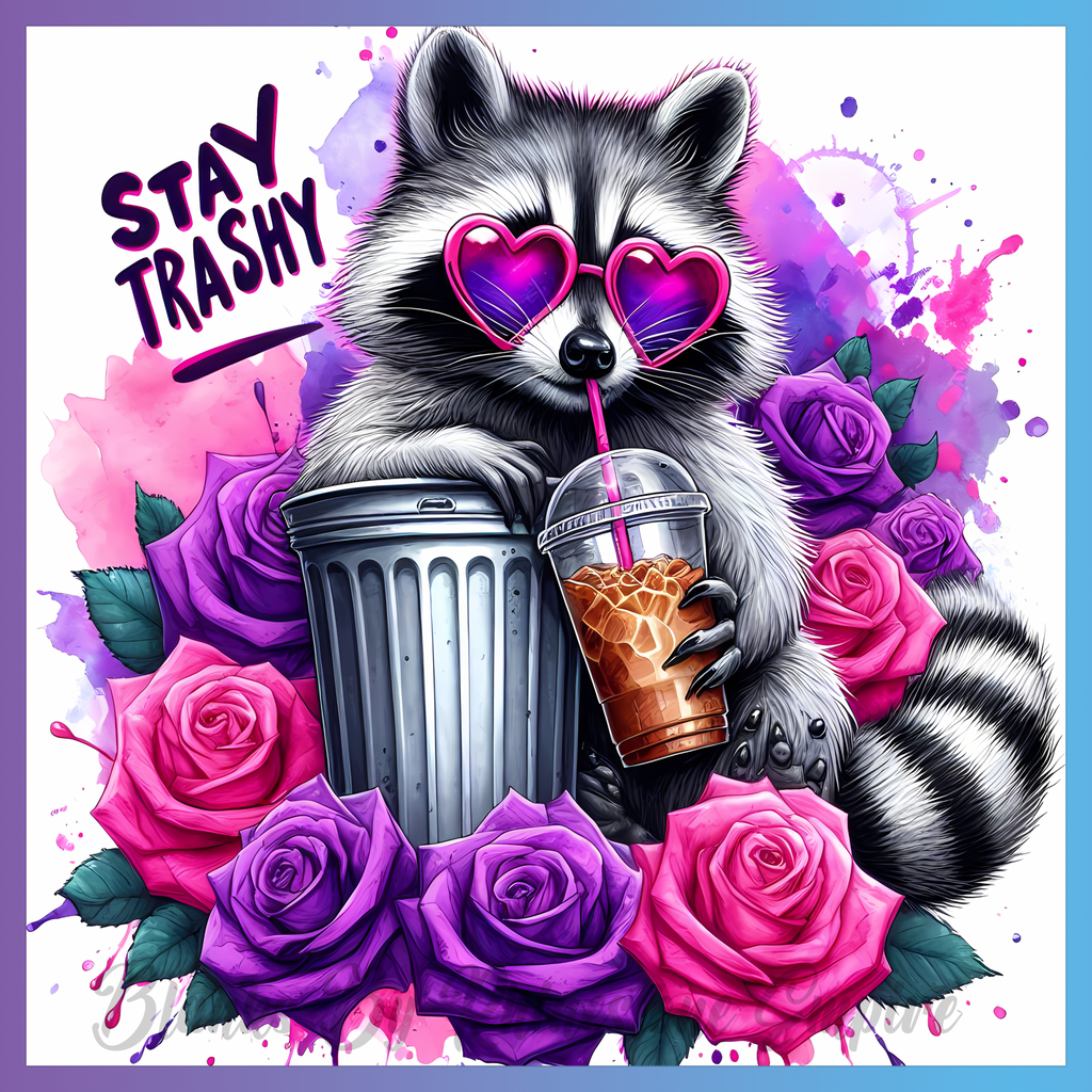 Theme: Raccoon with glasses, trash, flowers, pink.