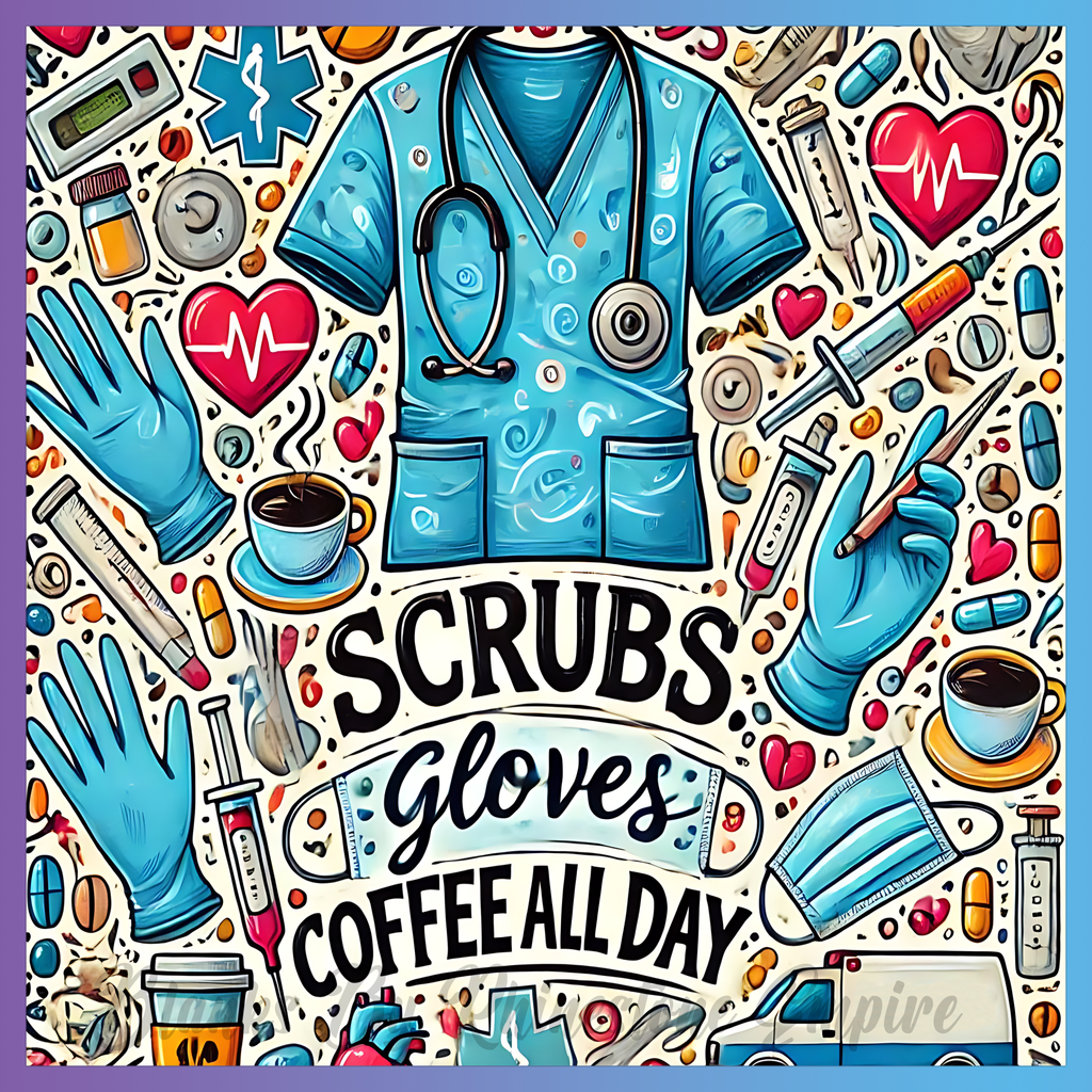Theme: Scrubs with medical, gloves, coffee, healthcare.