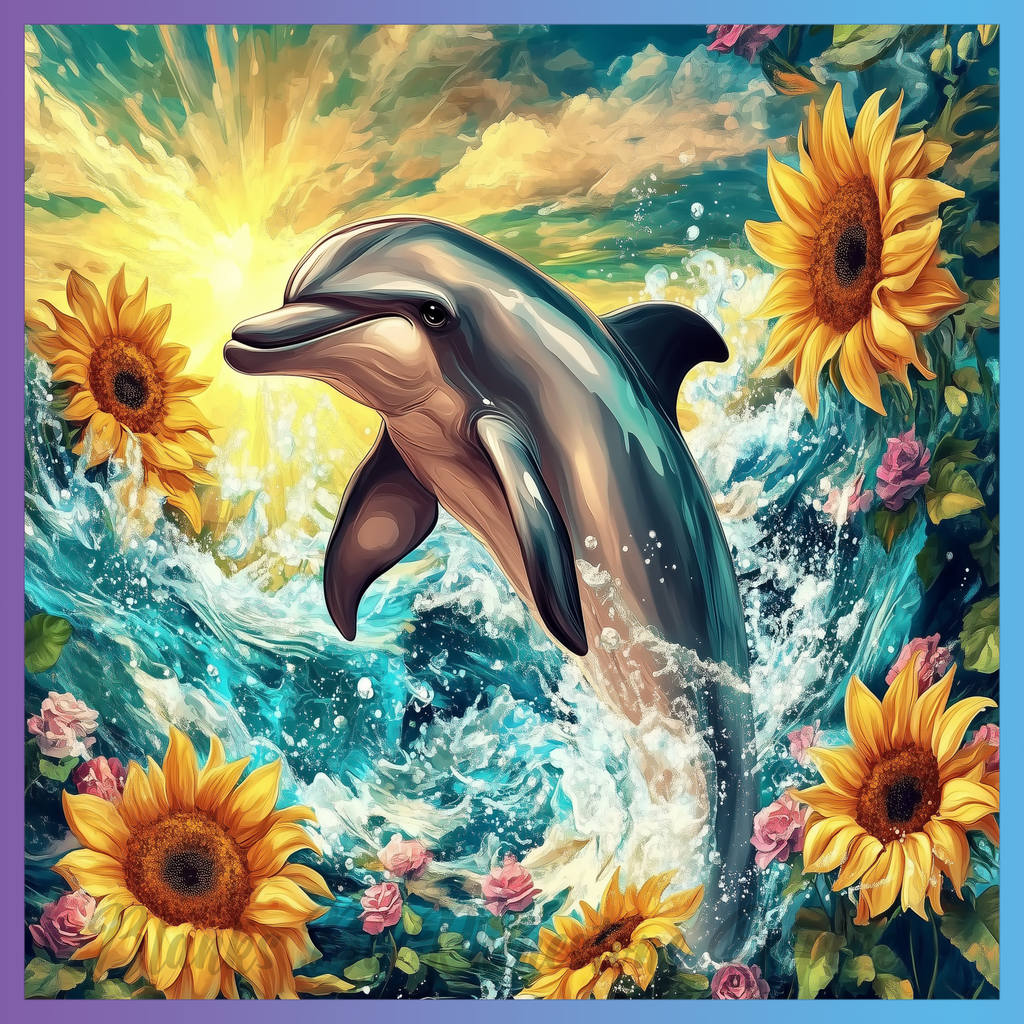 Theme: Dolphin with sunflowers, ocean, waves, sunset.