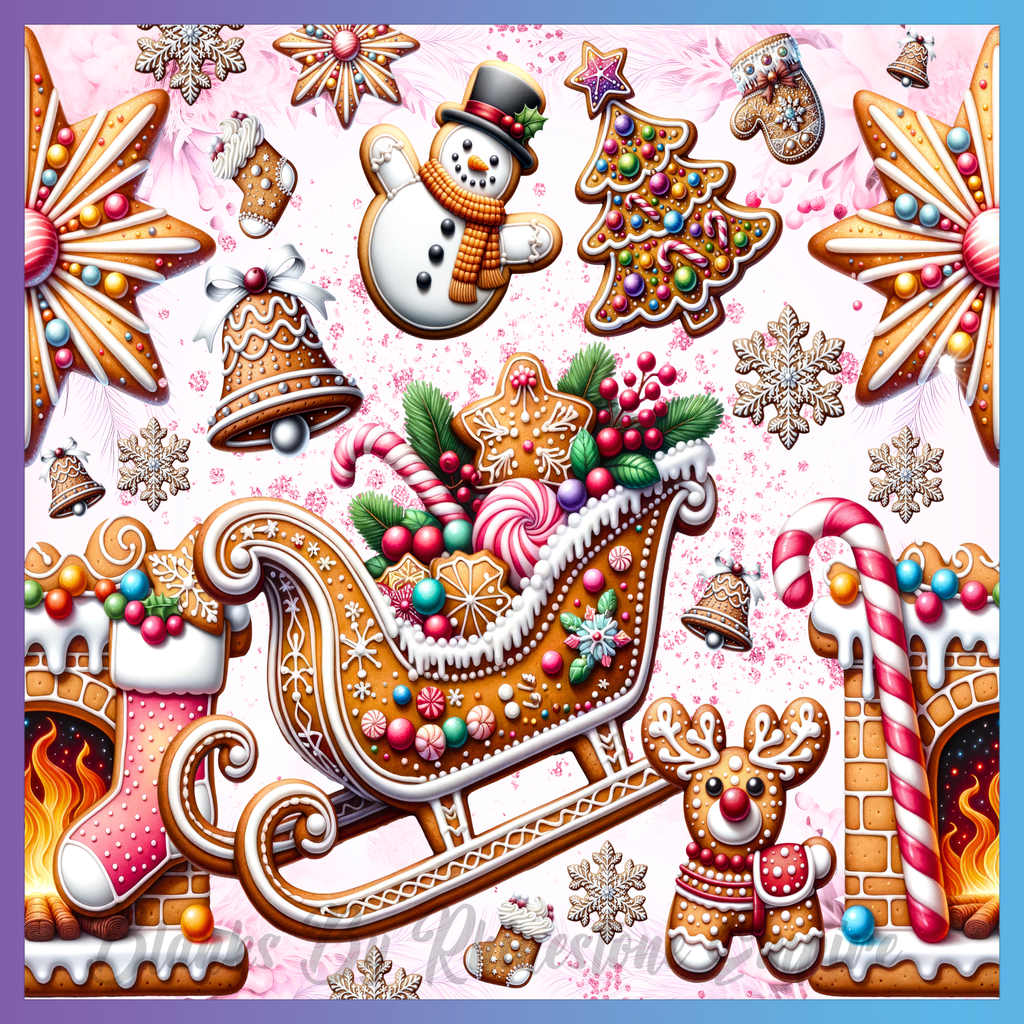 Theme: Sleigh with gingerbread, snowman, Christmas, decorations.