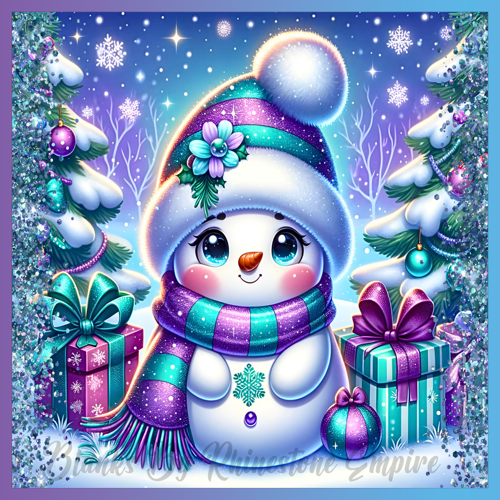 Theme: Snowman with winter, snow, presents, trees.