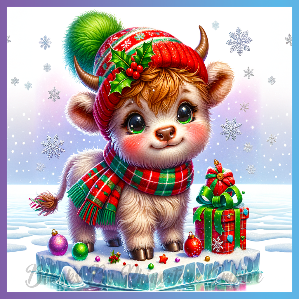 Theme: Calf with winter, hat, scarf, presents.