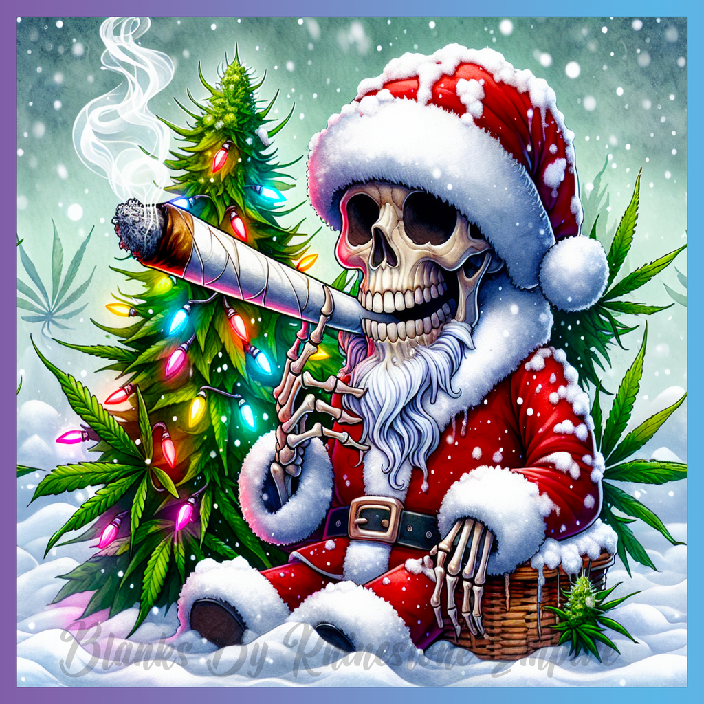 Theme: Skeleton with Santa, cigar, Christmas, tree.