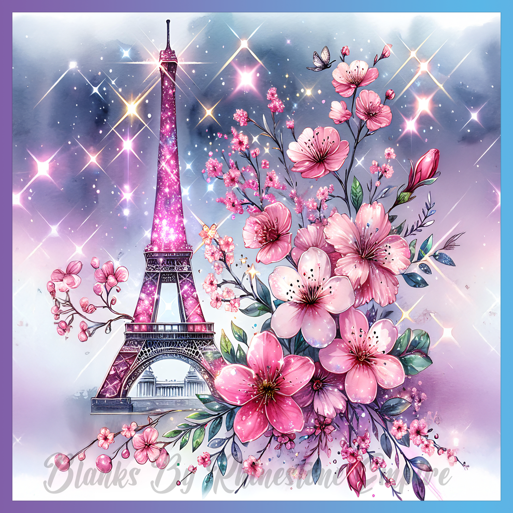 Theme: Eiffel with flowers, pink, sparkles, sky.
