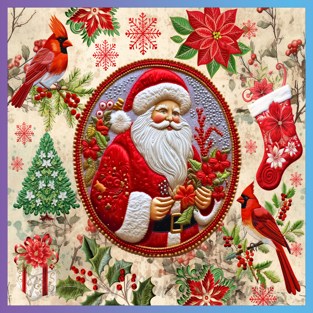 Theme: Santa with poinsettia, cardinals, snowflakes, gifts.