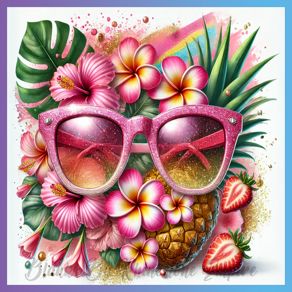 Theme: Sunglasses with flowers, pineapple, strawberries, tropical.