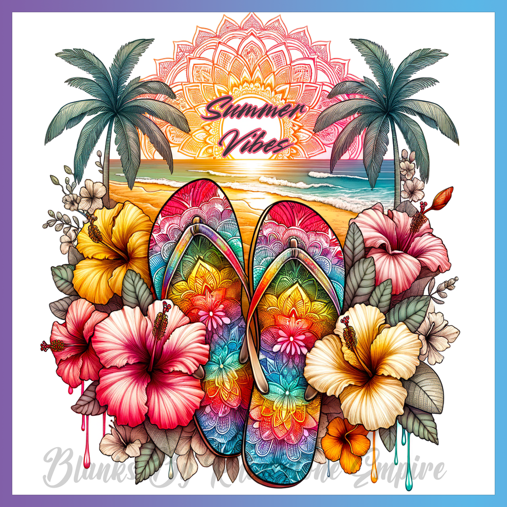 Theme: Flipflops with sunset, tropical, flowers, palms.